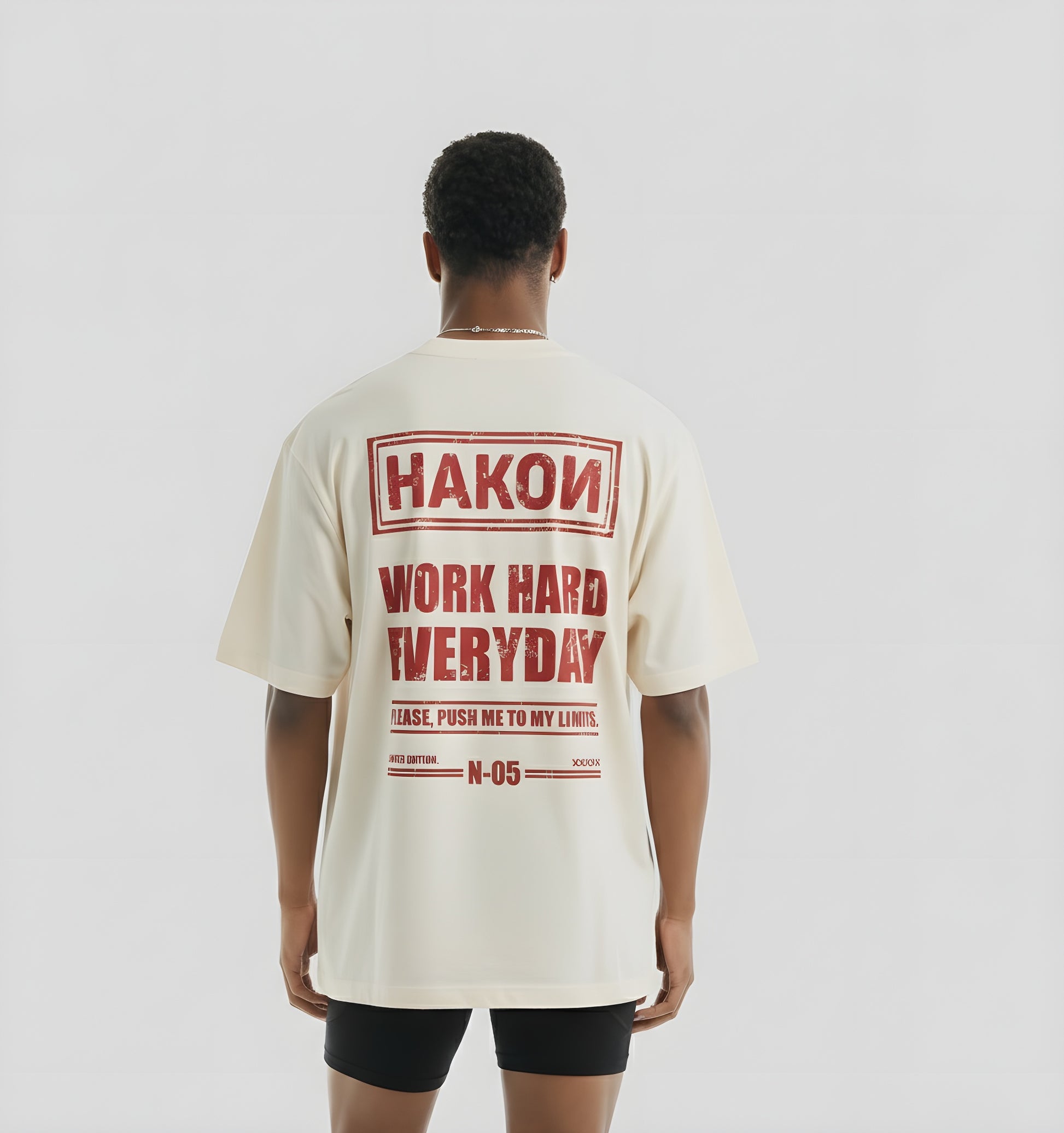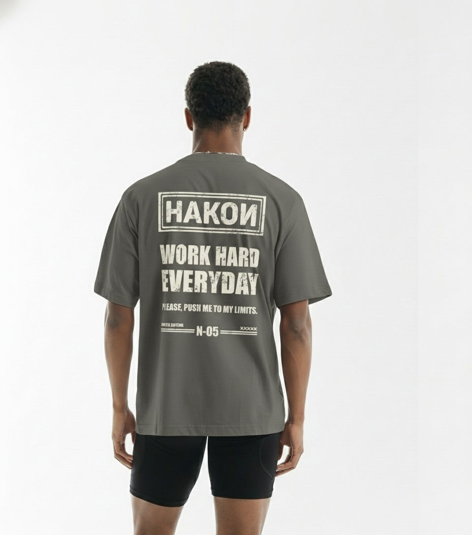 El corte oversize proporciona libertad de movimiento y un look relajado, ideal tanto para entrenar como para el día a día. El estampado trasero, con el mensaje “WORK HARD EVERYDAY – Please, push me to my limits”, está diseñado para quienes no conocen límites y se enfrentan a cada reto con convicción.